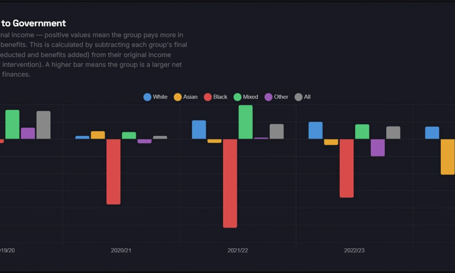 ONS моделирует полный путь налогов и пособий для каждого домохозяйства. Исследование, проведённое за 2023/2024 финансовый год (последние доступные данные), показало, что белый британец выходит в плюс. Его годовой вклад в финансы страны составляет 1444 £.