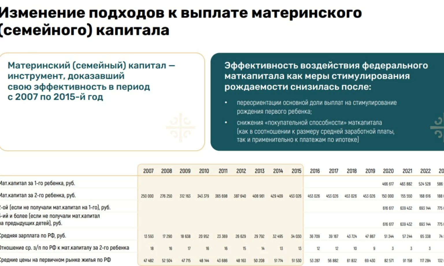 Негативной тенденцией последних лет стало резкое падение покупательной способности российского материнского капитала. В 2007 году выплата на второго ребёнка составляла 18,39 средних заработных плат по России, в 2015 году — 13,31, в 2025 году — 2,18. С 2020-го основная часть денег приходится на первенца. В настоящее время СКР растёт по рождению третьих и последующих детей, то есть у родителей, уже имеющих двух детей. При этом количество двухдетных семей уменьшается.